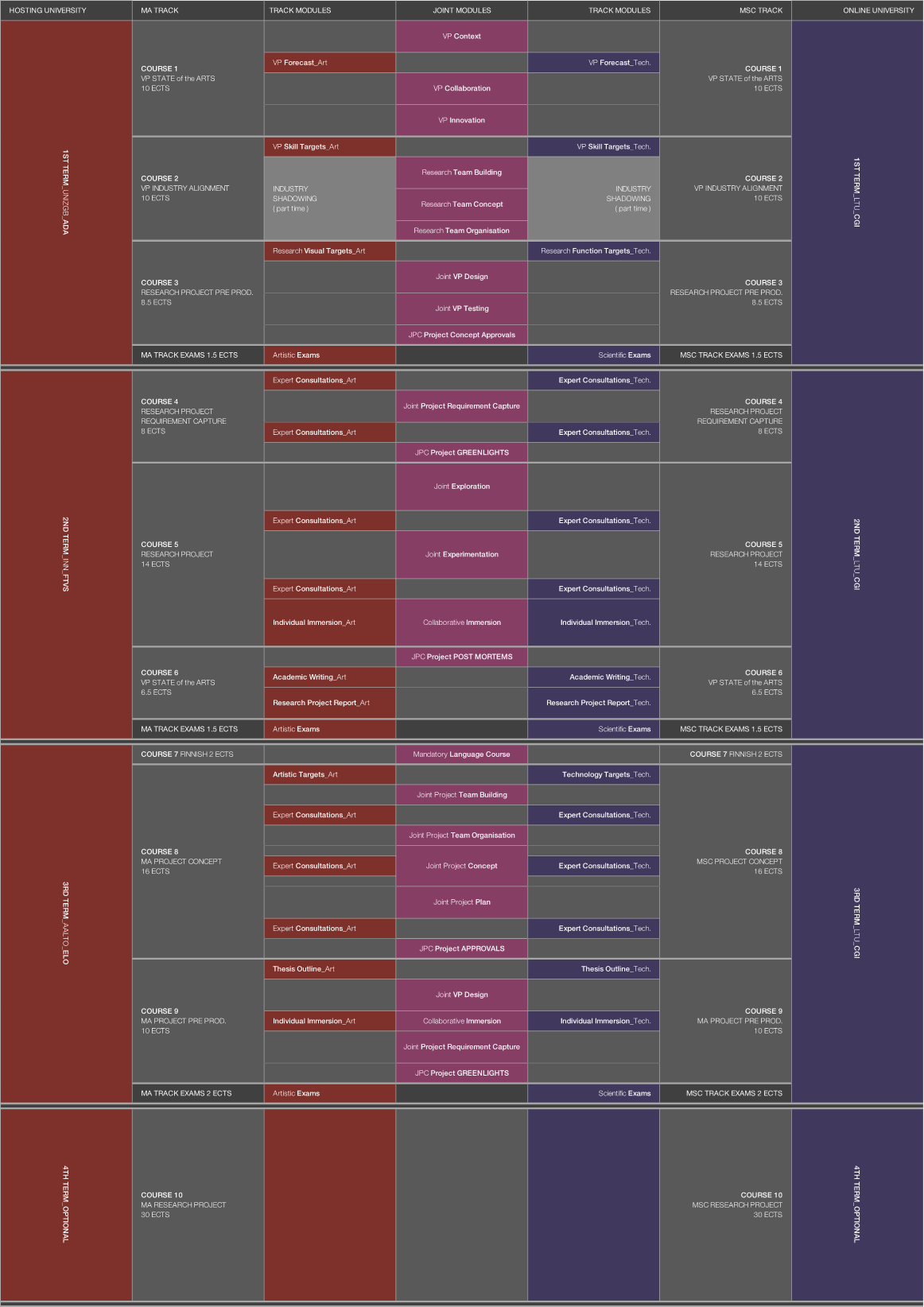 A unique aspect of the curriculum is the way it brings together students from the Art and Science domains to study both in parallel and in conjunction. At times collaborating in interdisciplinary cross-domain teams, in other periods immersed in their respective specialisations. During teamwork students co-create innovative products in innovative ways to foster “student-to-student” networks via joint experiences. A concept, tried and tested since 2005 at the Danish National Academy of Digital, Interactive Entertainment (DADIU), where around 100 students from art schools and universities from across Denmark congregate each year for a term of shared classes, joint workshops and interdisciplinary team productions.